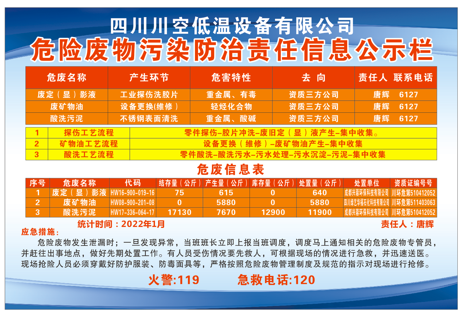 四川川空低溫設(shè)備有限公司——危險(xiǎn)廢物污染防治責(zé)任信息公示欄