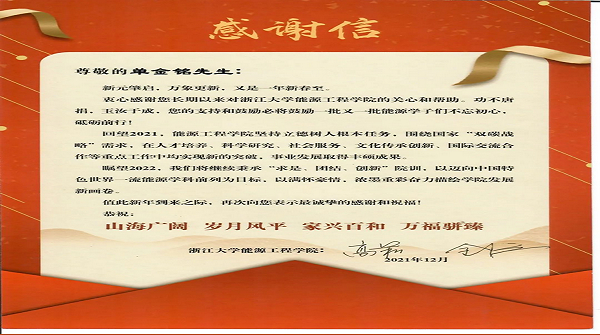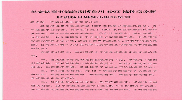 單金銘董事長給淄博魯川400T液體空分膨脹機(jī)項(xiàng)目研發(fā)小組的賀信