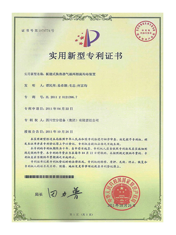 實(shí)用新型專利證書-板翅式換熱器氣液兩相流均布裝置