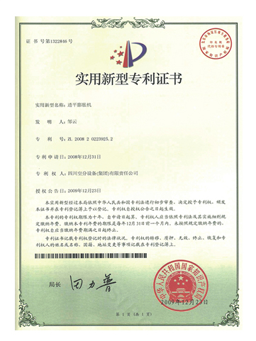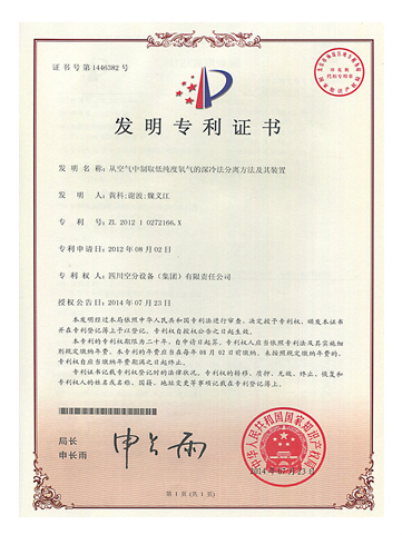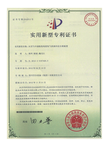 實(shí)用新型專利證書-從空氣中制取低純度氧氣的深冷法分離裝置