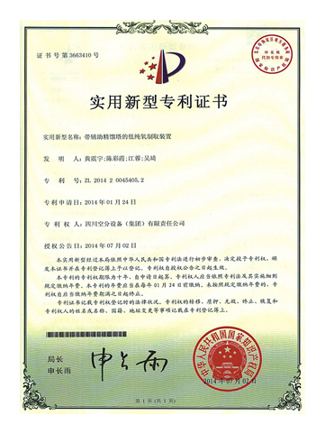 實(shí)用新型專利證書-帶輔助精餾塔的低純氧制取裝置