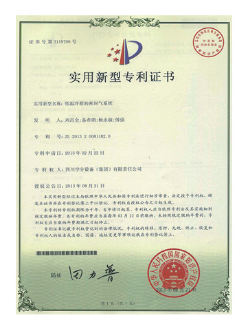 實(shí)用新型專利證書-低溫冷箱的密封氣系統(tǒng)