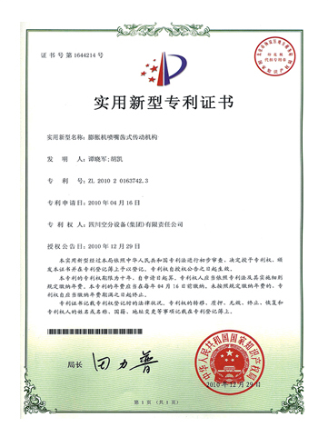 實(shí)用新型專利證書-膨脹機(jī)噴嘴齒式傳動(dòng)機(jī)構(gòu)