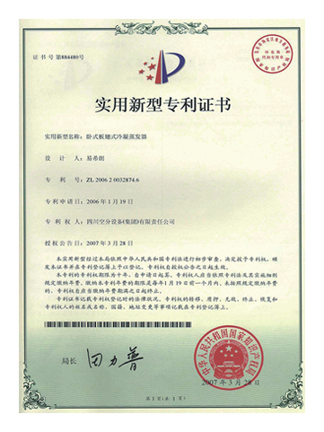 實(shí)用新型專利證書-臥式板翅式冷凝蒸發(fā)器
