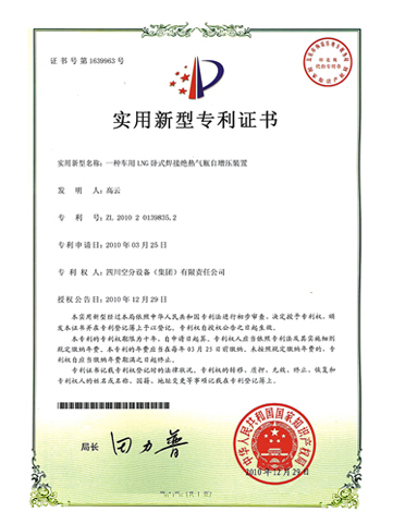實(shí)用新型專利證書-一種車用LNG臥式焊接絕熱氣瓶自增壓裝置