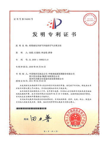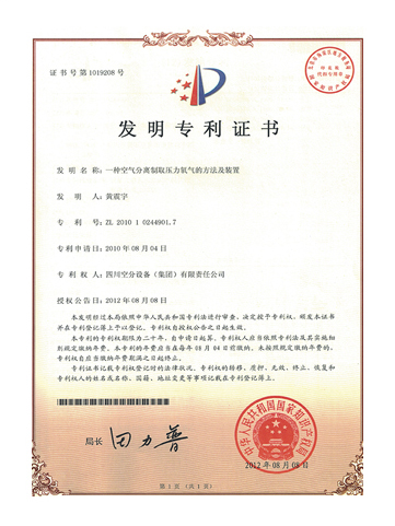 發(fā)明專利證書-一種空氣分離制取壓力氧氣的方法及裝置