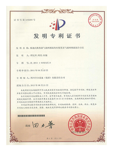 發(fā)明專利證書-板翅式換熱器氣液兩相流均布裝置及氣液兩相流混合方法