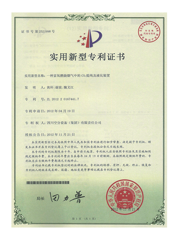 實(shí)用新型專利證書-一種富氧燃燒煙氣中的CO?提純及液化裝置