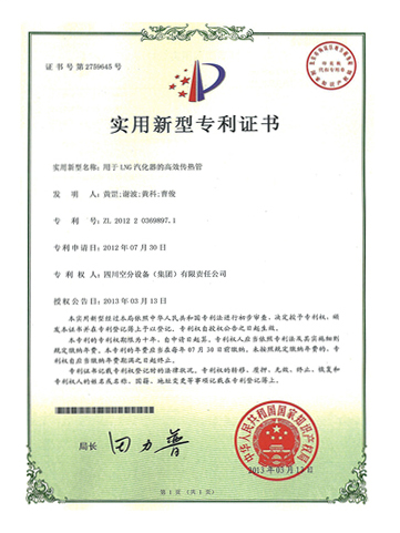 實(shí)用新型專利證書-用于LNG汽化器的高效傳熱管