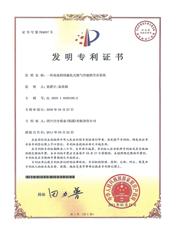 發(fā)明專利證書-一種高效利用液化天然氣冷能的空分系統(tǒng)
